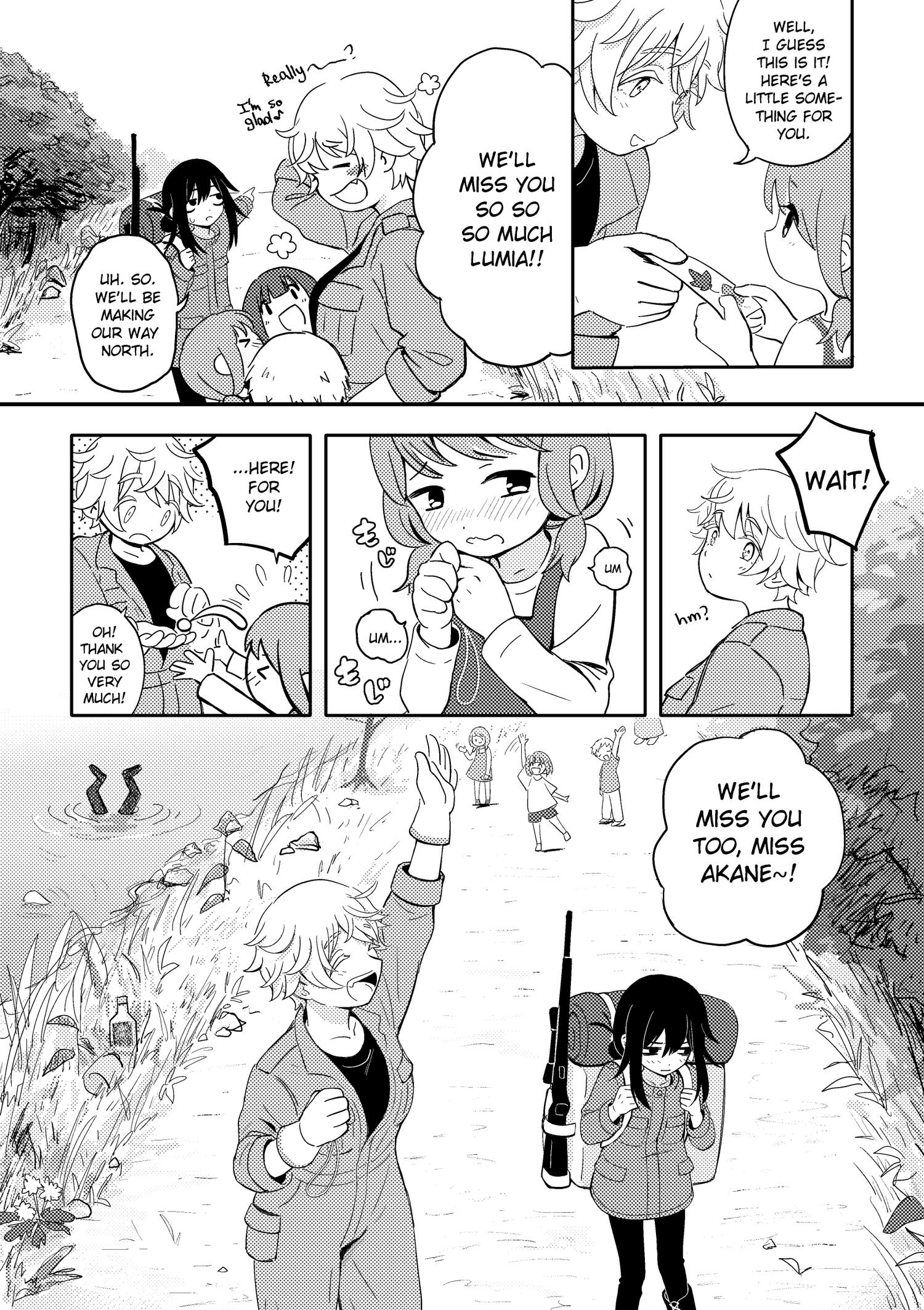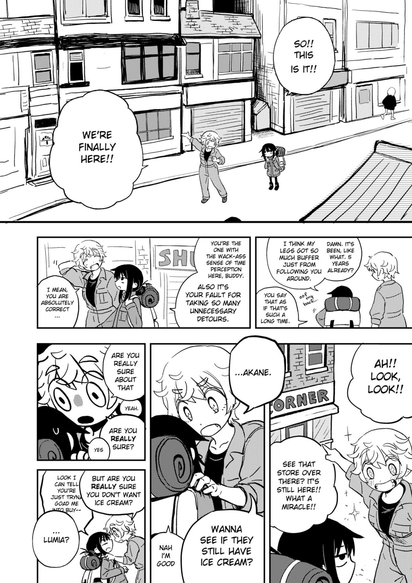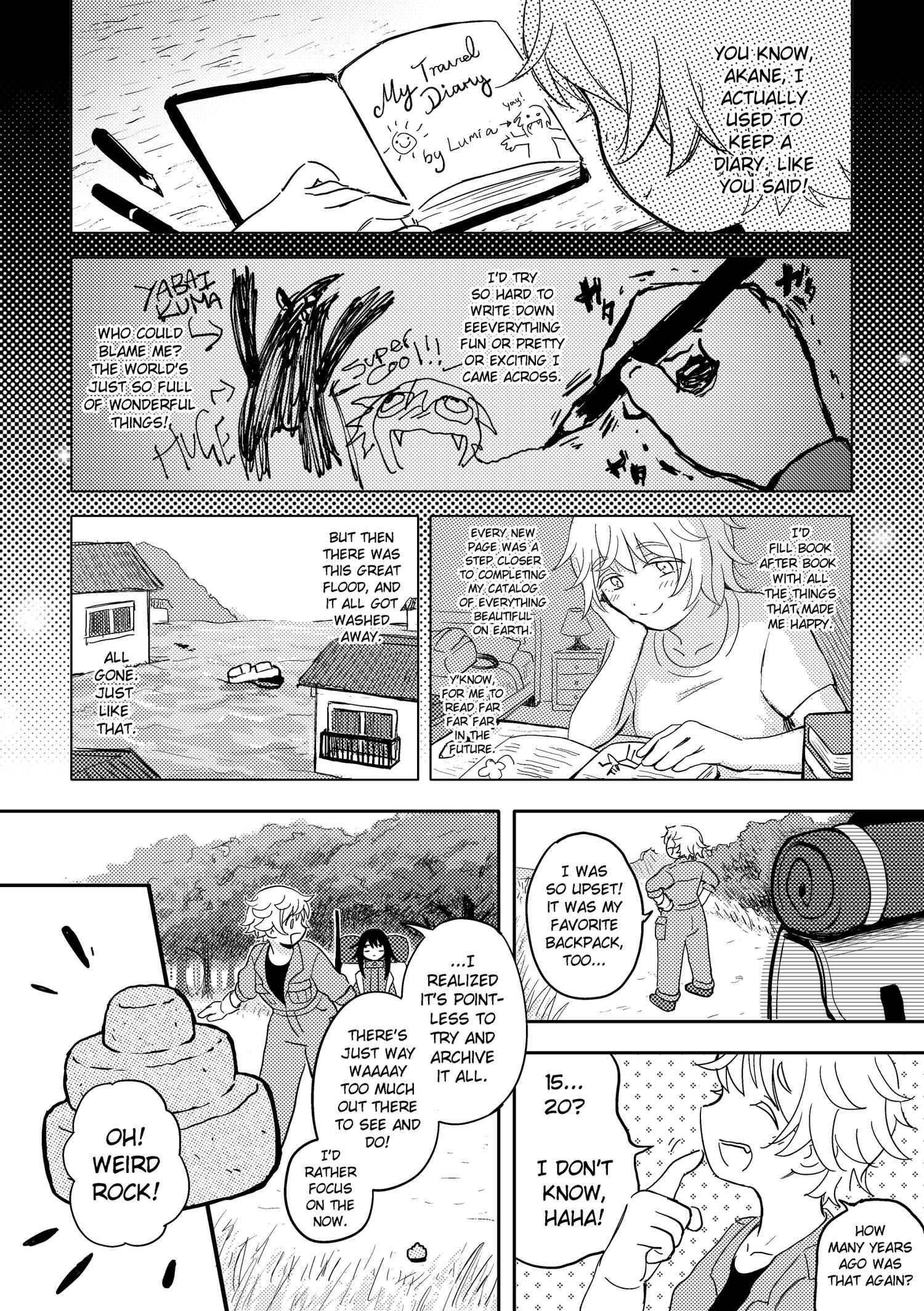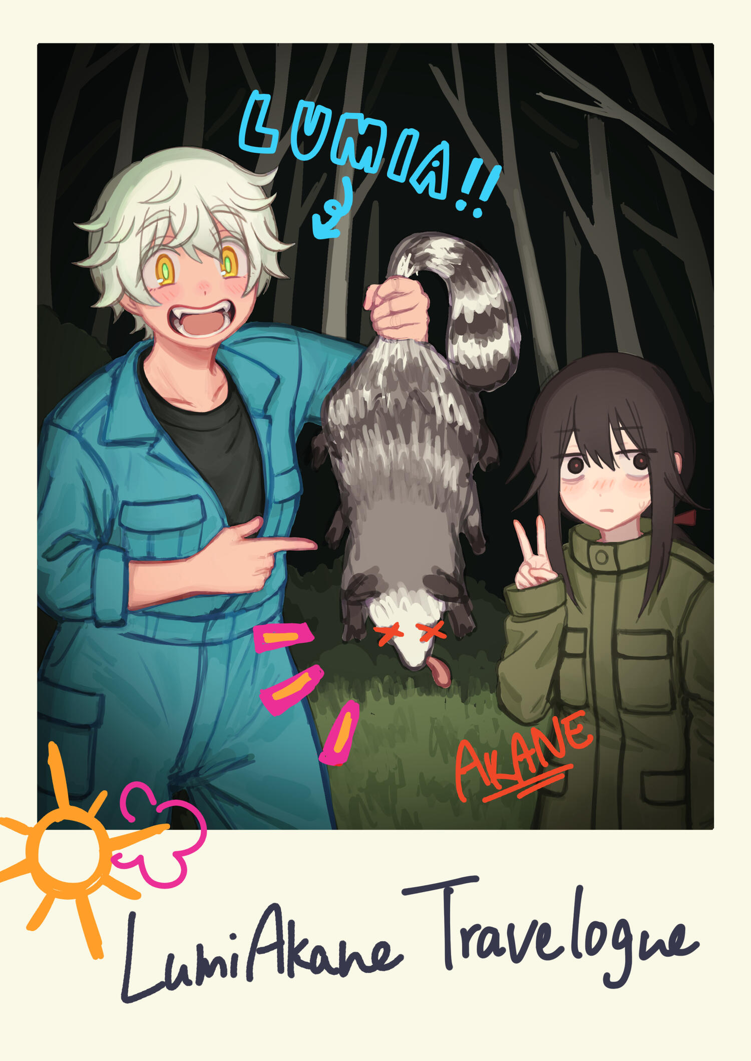 LumiAkane Travelogue is about an immortal with magic light powers and an optimistic outlook on life and a human being with a cynical attitude. together, they travel through a world on the edge of falling apart for a number of years and occasionally wax philosophical about the meaning of life and various other things.read right to left.full oneshot coming soon sometime this year.... hopefully sooner than later....